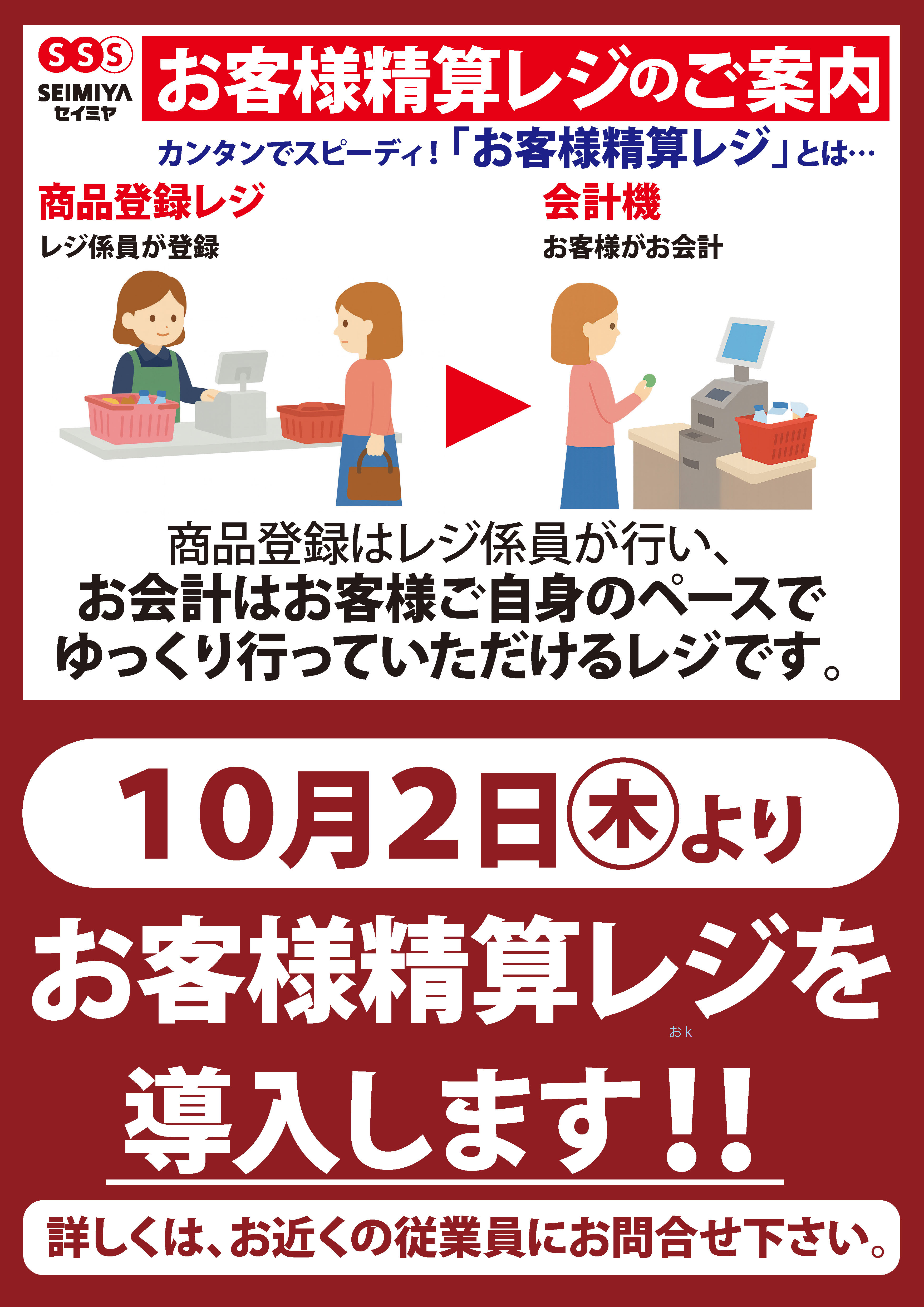 2025/10/01 【鉾田安房店】セルフレジ導入のご案内 お知らせ 鉾田安房店 LINEで送る Tweet 10月2日㊍より鉾田安房店でセミセルフレジを導入致します。商品の登録はレジ係が行い、お会計は精算機でお客様ご自身が行うので、お客様のペースでゆっくりお会計できます。 LINEで送る Tweet