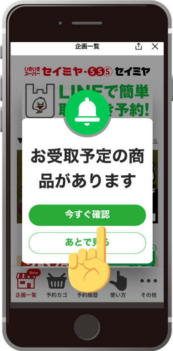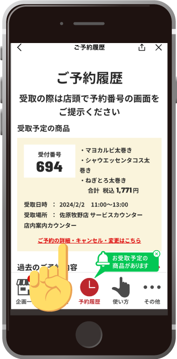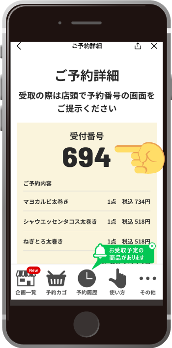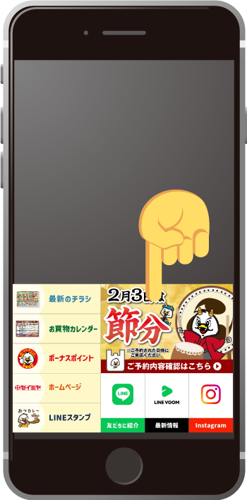 当日はLINEのメニュー画面右下の「節分」をレジでタップして、受付番号を伝えてご精算・お引取りをお願いいたします。