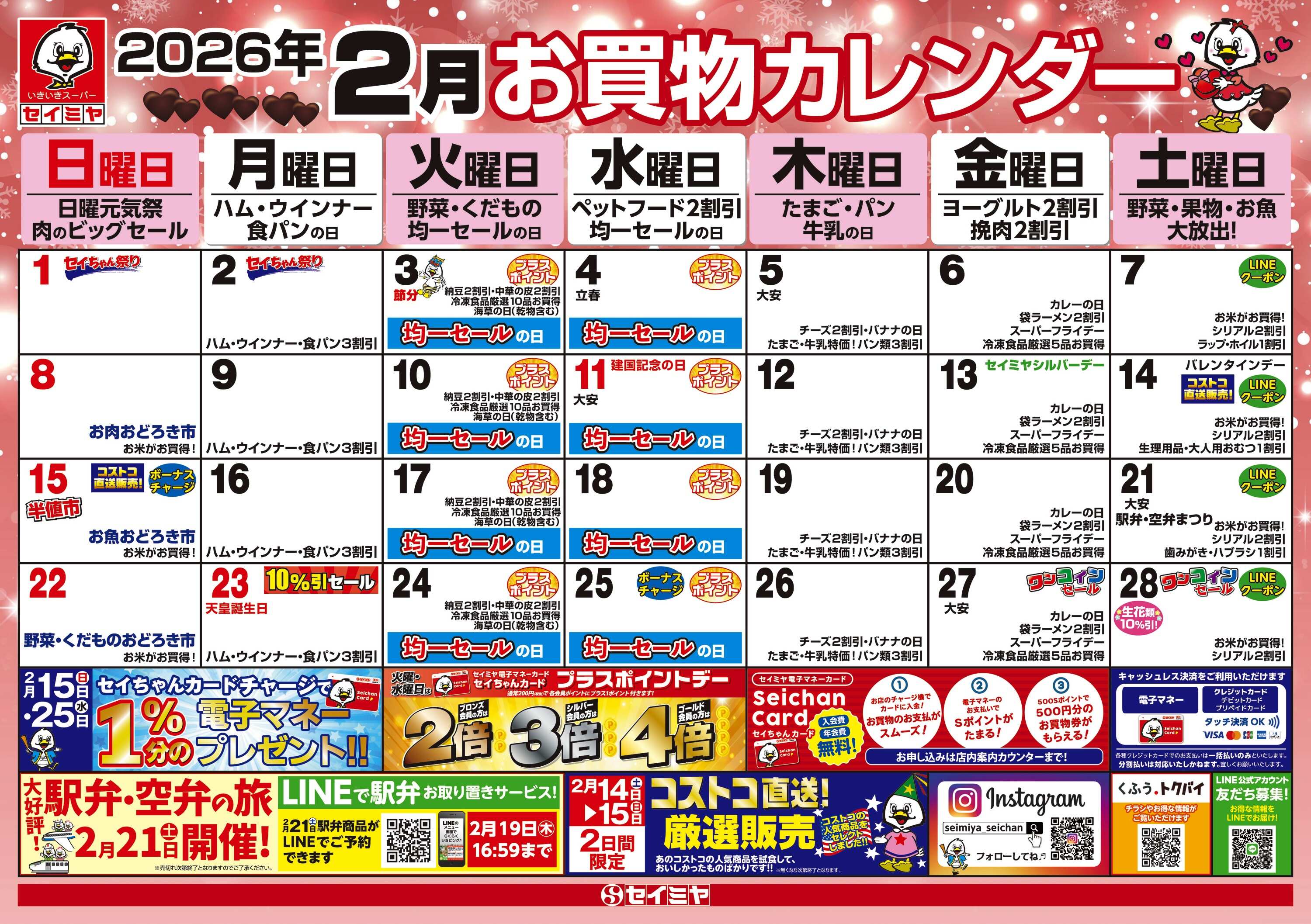 2026/01/30 2月のお買物カレンダー お買物カレンダー TOP モール麻生店 潮来店 延方店 成田芝山店 鹿島東店 榎戸店 佐原玉造店 佐原牧野店 SMカレンダー 神栖店 LINEで送る Tweet 計画的なお買物にお役立てください!対象店舗は潮来店・神栖店・鹿島東店・延方店・モール麻生店・佐原牧野店・佐原玉造店・榎戸店・成田芝山店です。印刷されたカレンダーは店内にて配布しております。 LINEで送る Tweet